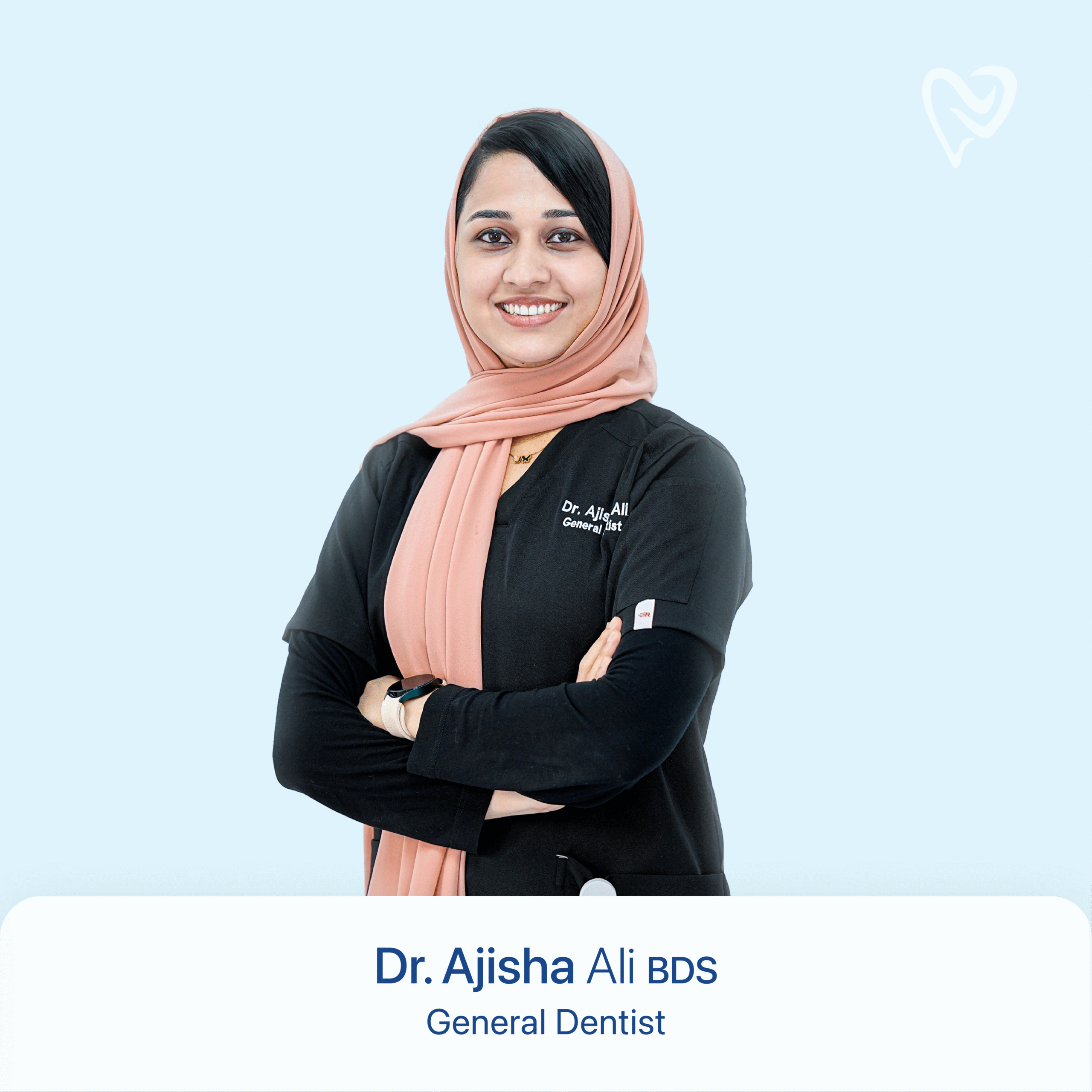 Dr. Ajisha Ali is an experienced general dentist with over six years of clinical practice, known for her meticulous work and patient-focused care. She earned her BDS from Annoor Dental College in Kerala, India, and further advanced her expertise with certification in Rotary Endodontics (Root Canal Treatment) and a Diploma in Aesthetic and Restorative Dentistry from the University of Nantes, France.
